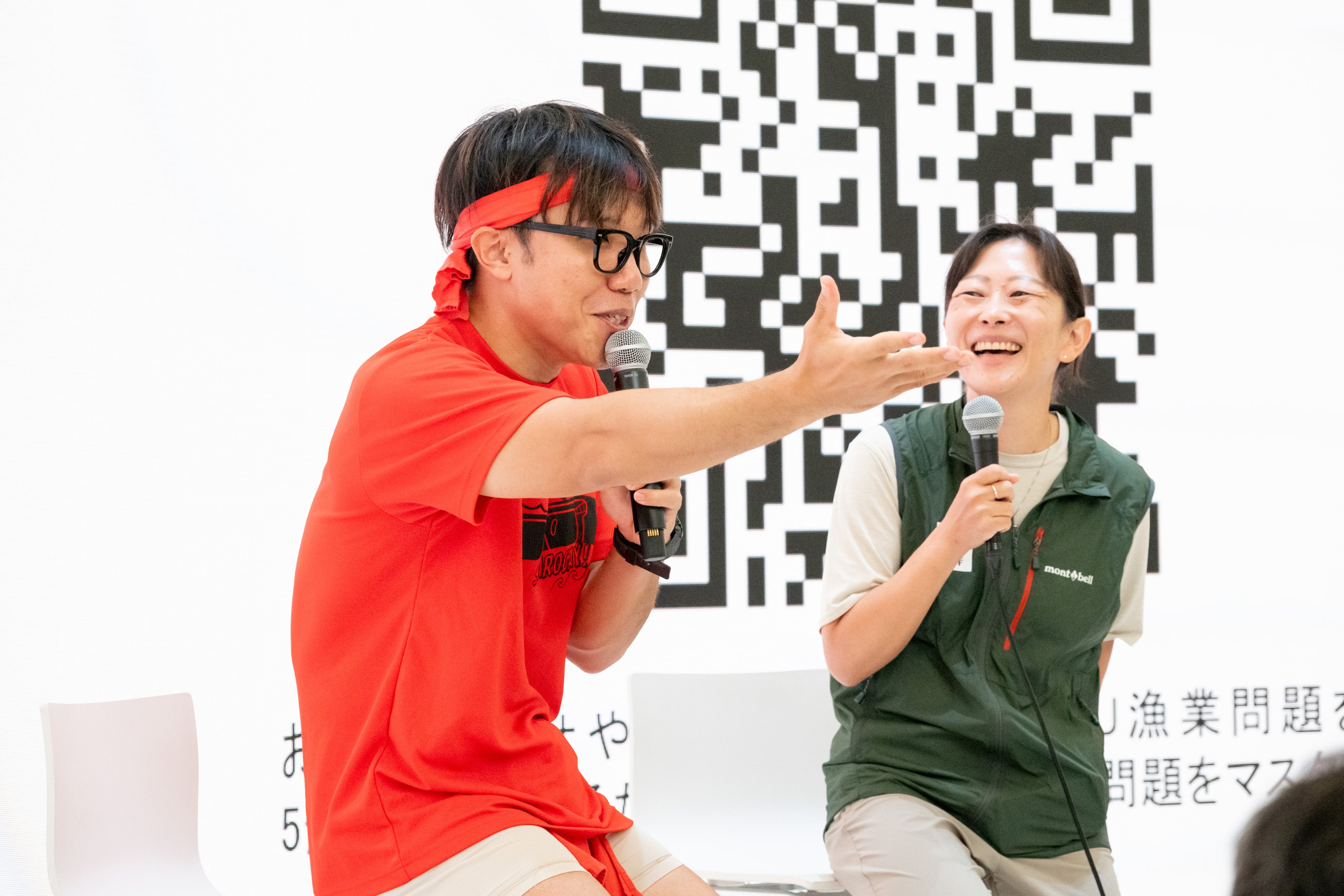 また、サステナブルシーフードの供給・普及を阻害するIUU漁業問題について、お笑い芸人のせやろがいおじさんが特別出演し、複雑な問題をコメディを交えて一般来場者にわかりやすく解説しました。壇上では、消費者一人ひとりがこの問題を知り、どのような水産物を選ぶのか考えることが必要だと熱く訴えかけました。