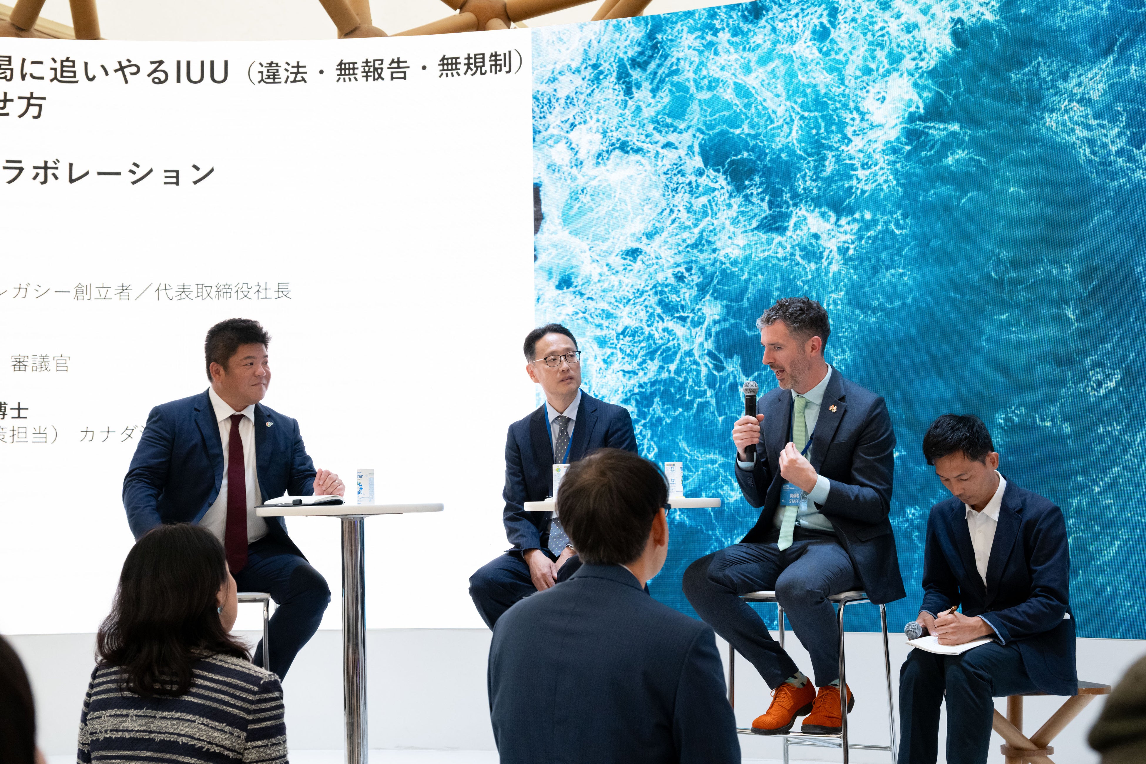 水産業界のサステナビリティにおいて最大の脅威とされるIUU漁業の実態と、その撲滅に向けた北西太平洋での政府間連携による取り組みなどについて、水産庁資源管理部の福田工審議官やカナダ漁業海洋省のニーアル・オディー博士らが解説し、現状の課題を語り合いました。福田審議官は「水産資源管理のための規制を守ろうとすると、船の登録や機材購入などのコストが発生する。利益をあげようとした結果、違法なIUU漁業が生まれているが、違法漁船を取り締まる船の派遣にも費用がかかり、政府としても大きな負担になっている」と問題点を指摘し、シーフードレガシーの花岡和佳男代表は「新鮮で安い魚を買うことが賢い買い物の仕方という意識を持つ人が多いと思うが、安さだけを追求すると違法な漁業が生まれてしまう可能性がある。取り締まりにも多額の税金が使われているが、消費者がしっかりとルールを守って捕獲された魚を買うことがIUU漁業の撲滅に効果的なのではないか」と消費者による選択の重要性を投げ掛けました。