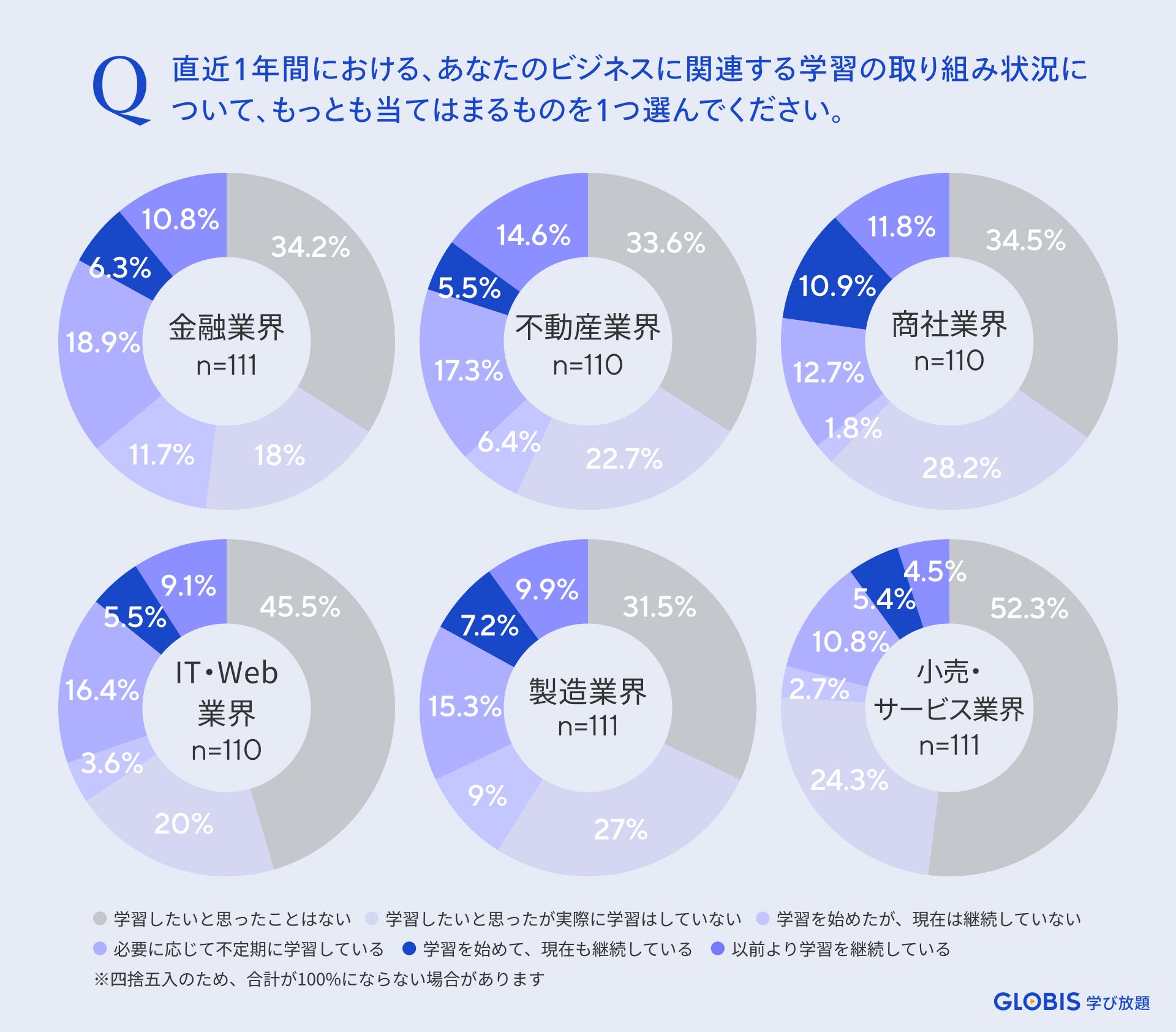 特に、製造業界、不動産業界、金融業界、商社業界では7割近くの回答者が「学習意欲あり」を示す回答を選択するなど、学習意欲が高い傾向が見られました。