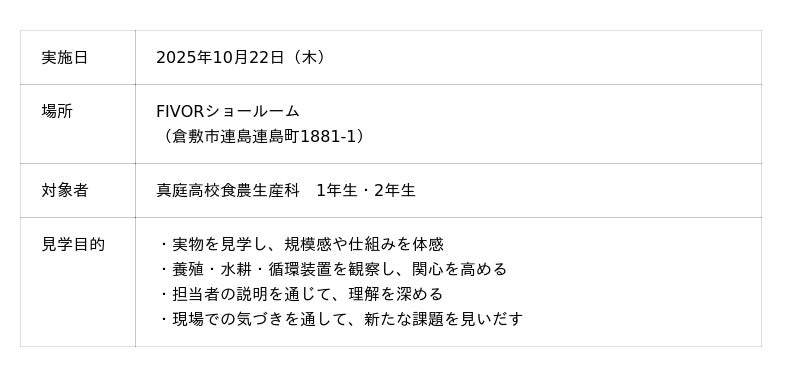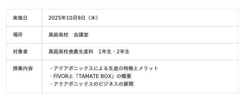 株式会社FIVOR(岡山県倉敷市/代表取締役社長:藤木大輔/読み:ファイバー/以下「FIVOR」)は、2025年10月より岡山県真庭市の協力のもと、岡山県立真庭高等学校(岡山県真庭市/校長:竹内成長/以下「真庭高校」)と連携し、持続可能な栽培システム「アクアポニックス」を使った先端技術学習を開始します。
