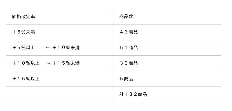 当社は、安全・安心な商品を、適正な価格でお客様に安定供給するべく、生産性向上や費用節減等のコストダウンを図り、合理化と経費削減に努めてまいりましたが、企業努力のみでコストアップを吸収することが極めて困難な状況であることから、この度、全対象商品において平均+8.8%の価格改定を実施することといたしました。