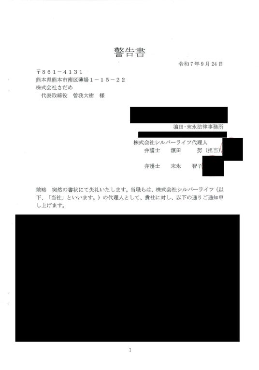 株式会社さだめ(本社:熊本市、代表取締役:曽我 大樹)は、一次資料(黒塗り)に基づく公開質問状を株式会社シルバーライフに送付・掲載しました。
