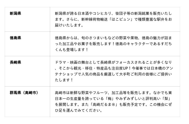 ・ 10月は、新潟県・徳島県(21-22日)、長崎県・群馬県(高崎市)(23-24日)の名産品が集結