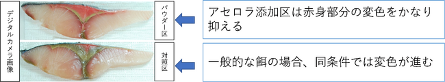 別途実施した比較官能検査の結果については、上記官能検査結果と同様に「血合い筋の色調が鮮やか」で「生臭さが少ない」という評価になった。これらもアセロラの抗酸化作用の結果と推測される。