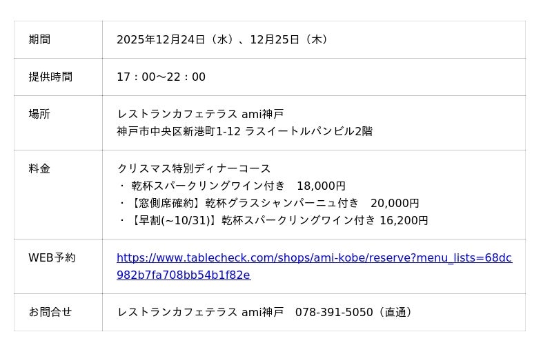 「ラスイートルパンビル」の2階にある「レストランカフェテラス ami神戸(料理長:笠原 鉄平、所在地:神戸市中央区)」は、この冬、初めてのクリスマスシーズンを迎えます。