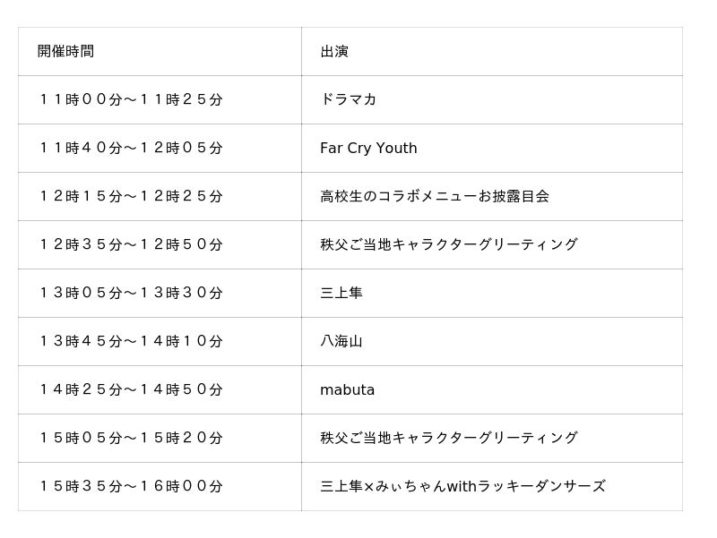 また、イベントステージでは秩父にゆかりのあるアーティストによる「ライブパフォーマンス」、「秩父地域のご当地キャラクターグリーティング」のほか、当社および地元の高校とが連携し、地元食材を活かしたメニュー開発や商品化で秩父地域の魅力を発信する取り組みにより考案されたコラボメニューのお披露目も実施いたします。