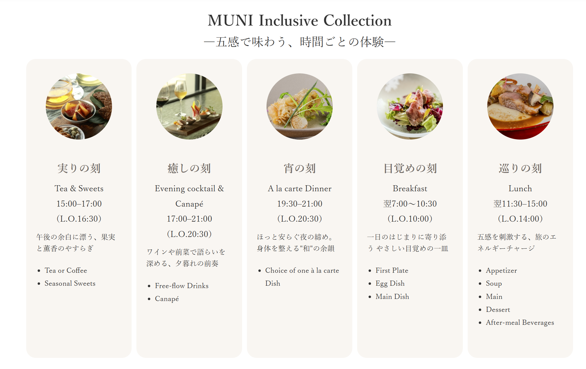 MUNI KYOTOでは、2025年11月7日より、滞在中の時間に合わせてお食事やお飲み物を自由にお楽しみいただける「MUNI Inclusive Collection」の提供をスタートいたします。