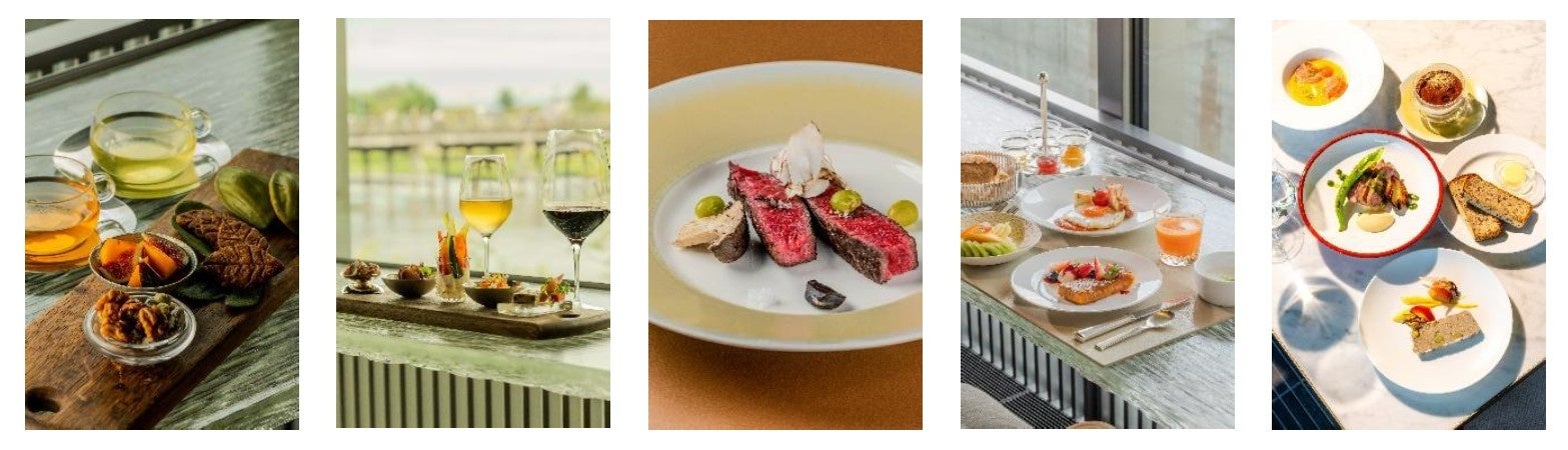 嵐山の自然とともに流れる一日を、五つの美しい時間で味わう、「季節と感性にまかせて、ひとときの自由を。」をテーマに、チェックイン後のティー&スイーツ、夕どきのイブニンフカクテル&カナッペ、ディナー、そして翌朝の朝食からランチまで、五つの時間帯に寄り添う多彩な味わいをご用意しました。ご宿泊者様限定のオプションとして、予約や時間に縛られず、心の赴くままに嵐山の自然とともに過ごす“余白の愉しみ”をご提案します。