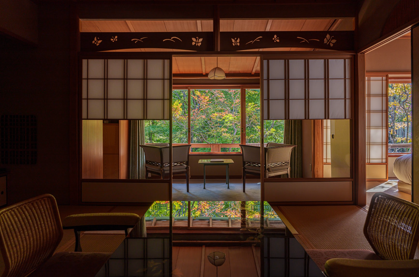色付く紅葉が漆のテーブルに映える客室