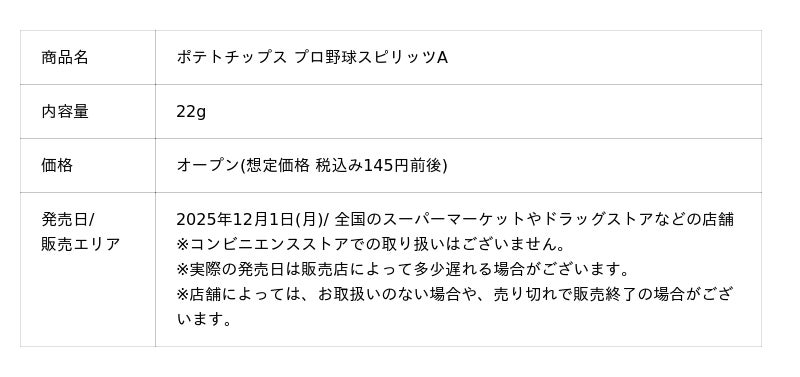 カルビー株式会社(本社:東京都千代田区、代表取締役社長兼CEO:江原 信、以下、カルビー)は、株式会社コナミデジタルエンタテインメント(本社:東京都中央区、代表取締役社長:早川 英樹、以下KONAMI)の運営するモバイルゲーム「プロ野球スピリッツA」(以下、プロスピA)とコラボレーションし、選手のカードが1枚付いた商品『ポテトチップス プロ野球スピリッツA』(カードは全24種類)を、2025年12月1日(月)から全国のスーパーマーケットやドラッグストアなどで期間限定発売します(2026年4月終売予定)。