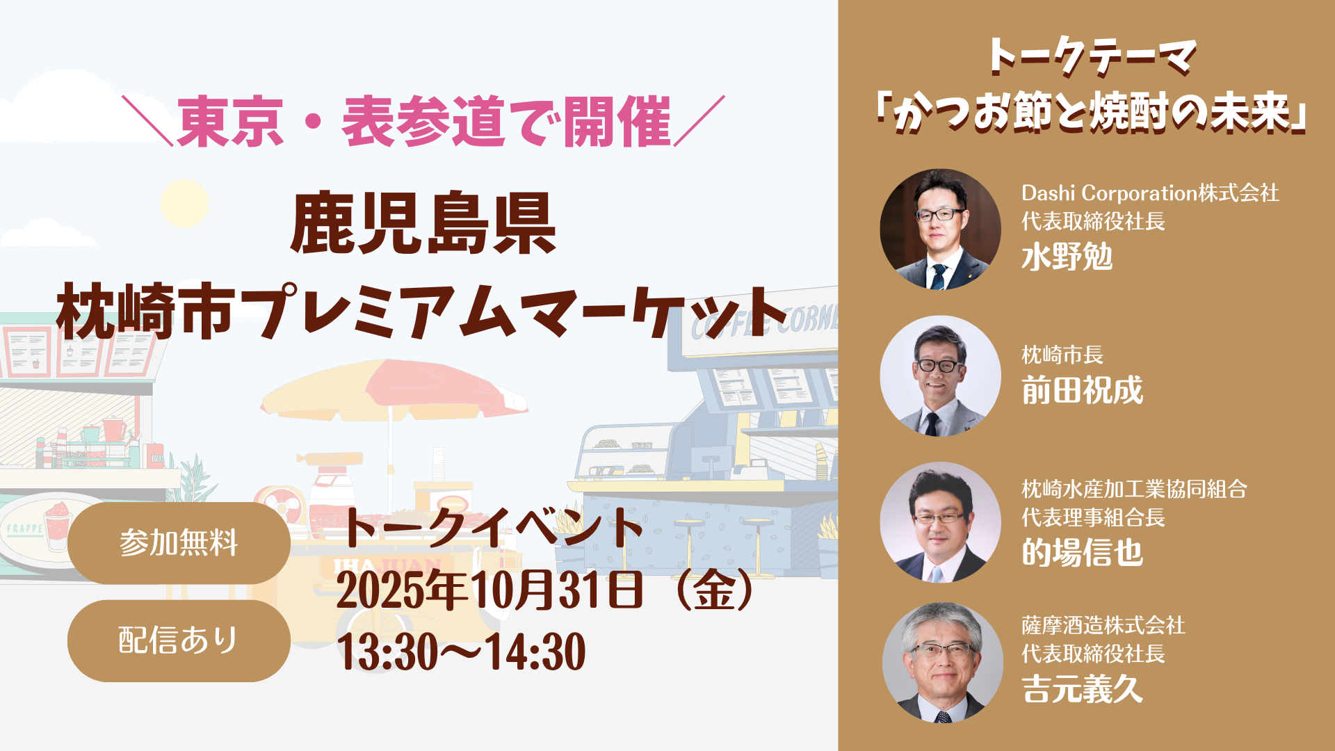 Dashi Corporation株式会社(本社:東京都品川区)の代表取締役 水野勉が、2025年10月31日(金)13:30より、ワールド北青山ビル(東京都港区)で開催される「枕崎市プレミアムマーケット」のトークイベント「かつお節と焼酎の未来」に登壇いたします。