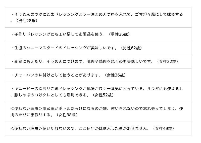 ドレッシングの利用状況や購入時の重視点などについて聞いています。調査結果をお知らせいたします。