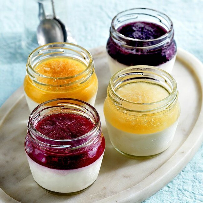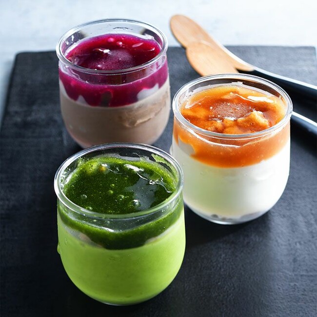 ヨーグルトと仏産チーズで仕立てたチーズジェラートと、果汁100%のジュレが2層に。フルーティな中に潜むコクと酸味、エアリーな口どけが新鮮。ひと瓶に約100億個の乳酸菌配合&希少糖使用のヘルシーさも◎。