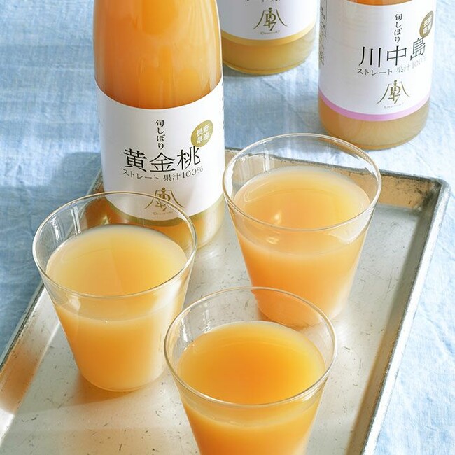 日本を代表する3つのブランド桃を旬の時期に搾汁。それぞれ搾ったままの香りを閉じ込めたストレートジュースです。「川中島白桃」はやわらかな甘み、「あかつき」は軽やかな風味が印象的。「黄金桃」はトロピカルな香りとほんのり酸味が心地いい。氷を入れず搾りたてそのままのおいしさを堪能して。