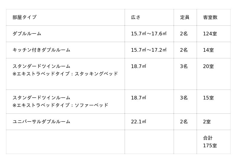 2. 全室15平方メートル 以上、長期滞在にも最適なゆとりある「ダブルルーム」が7割以上