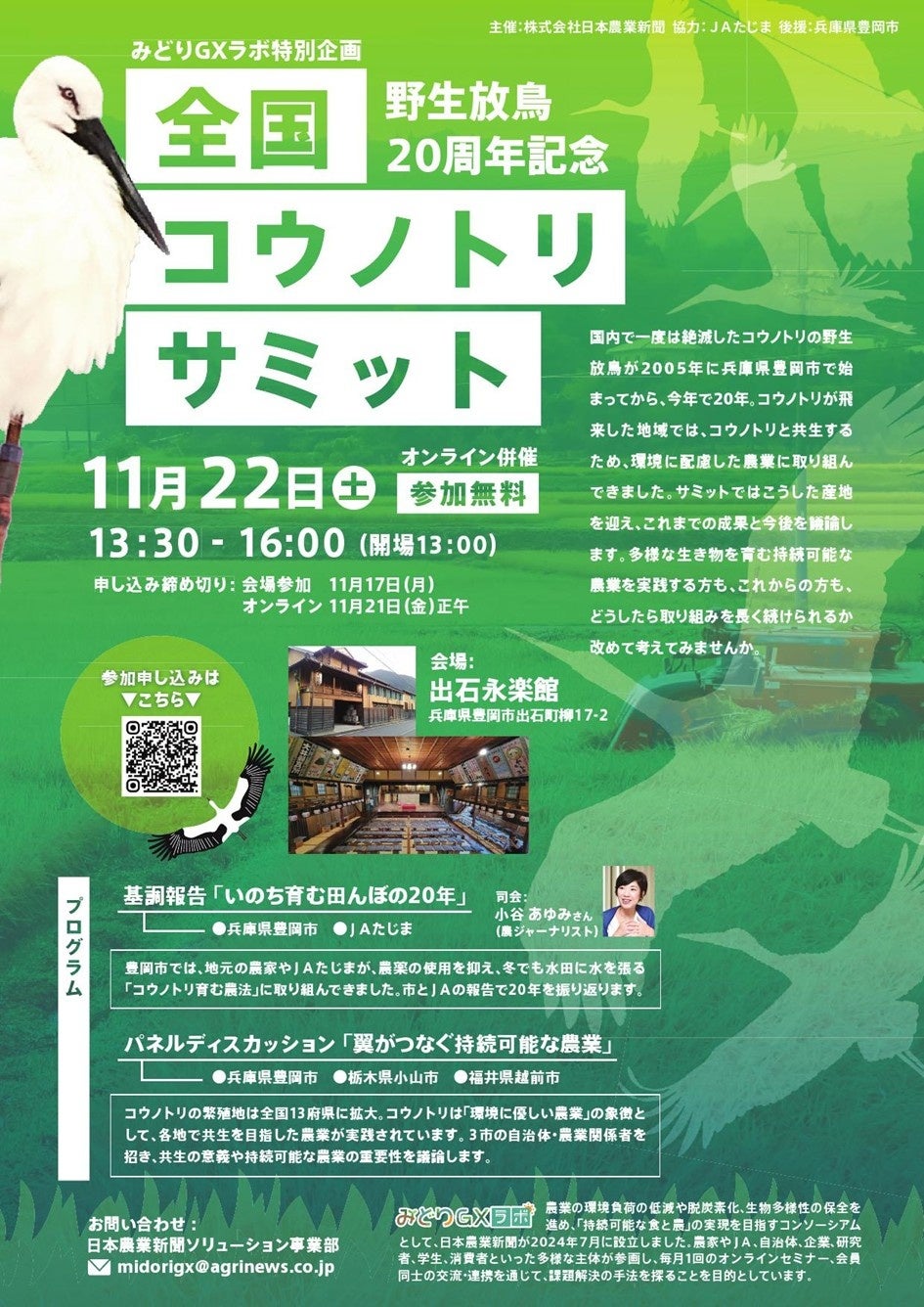 会場は大ヒット映画「国宝」のロケ地として話題の芝居小屋・出石永楽館。会場での参加者には、JAたじま産の「コウノトリ育むお米」2合(300グラム)をプレゼントします。締め切りは会場参加が11月17日(月)、オンラインが11月21日(金)正午です。