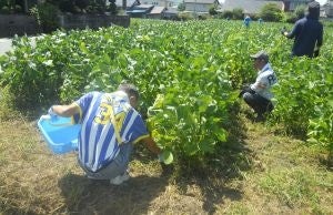 大豆畑で除草作業を行う就労継続支援事業所の皆さん