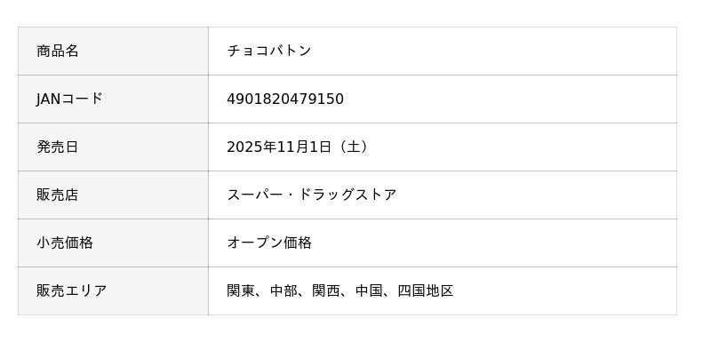 敷島製パン株式会社(Pasco)は、学習院大学経済学部の学生と共同開発した「チョコバトン」を、11月1日(土)より、関東、中部、関西、中国、四国地区にて発売します。