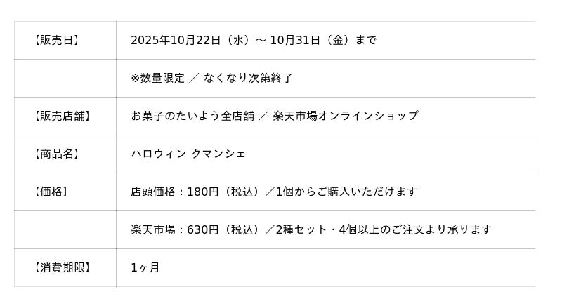 株式会社太陽社(所在地:千葉県匝瑳市飯倉293、代表取締役:片岡正裕)が展開する千葉県で長年愛される菓子店「お菓子のたいよう」は、10月22日(水)よりハロウィン限定スイーツ第2弾、クマ型メープルフィナンシェ『クマンシェ』を発売いたします。
