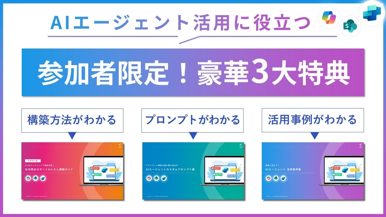 さらに、セミナーで学んだ知識をすぐに社内で実践できるよう、参加者限定特典としてAIエージェントの活用に役立つ3つの資料を無料でご提供いたします。