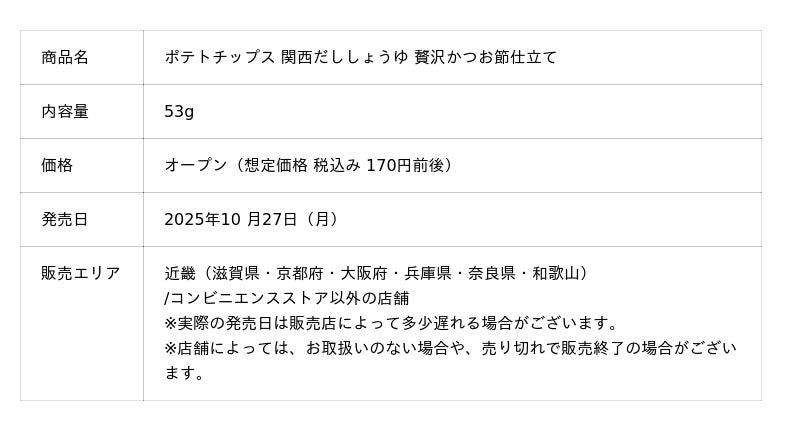 カルビー株式会社(本社:東京都千代田区、代表取締役社長兼CEO:江原 信)は、中部・近畿エリアで発売している「ポテトチップス 関西だししょうゆ」が11月に発売30周年を迎えることを記念して、『ポテトチップス 関西だししょうゆ 贅沢かつお節仕立て』を2025年10月27日(月)より近畿エリアのコンビニエンスストア以外の店舗で数量限定発売します(なくなり次第、終了)。さらに10月24日(金)からは、大阪環状線、JRゆめ咲線で、発売30周年を記念した車内ラッピング1編成も運行します。