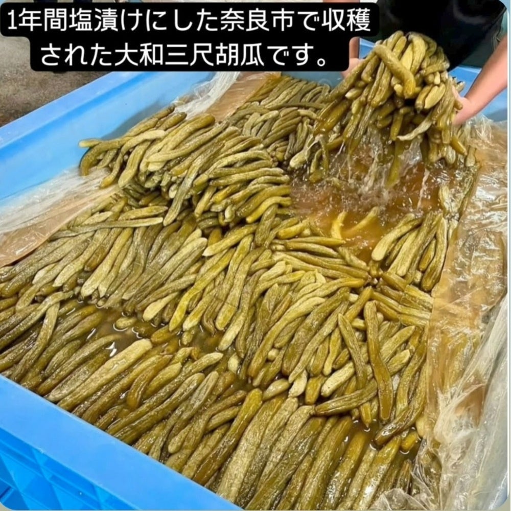 奈良市で収穫されて、約一年塩漬けにされた胡瓜。発酵されることにより、酸性環境を生み出し、腐敗菌の繁殖を防ぐことで長期保存が可能となります。