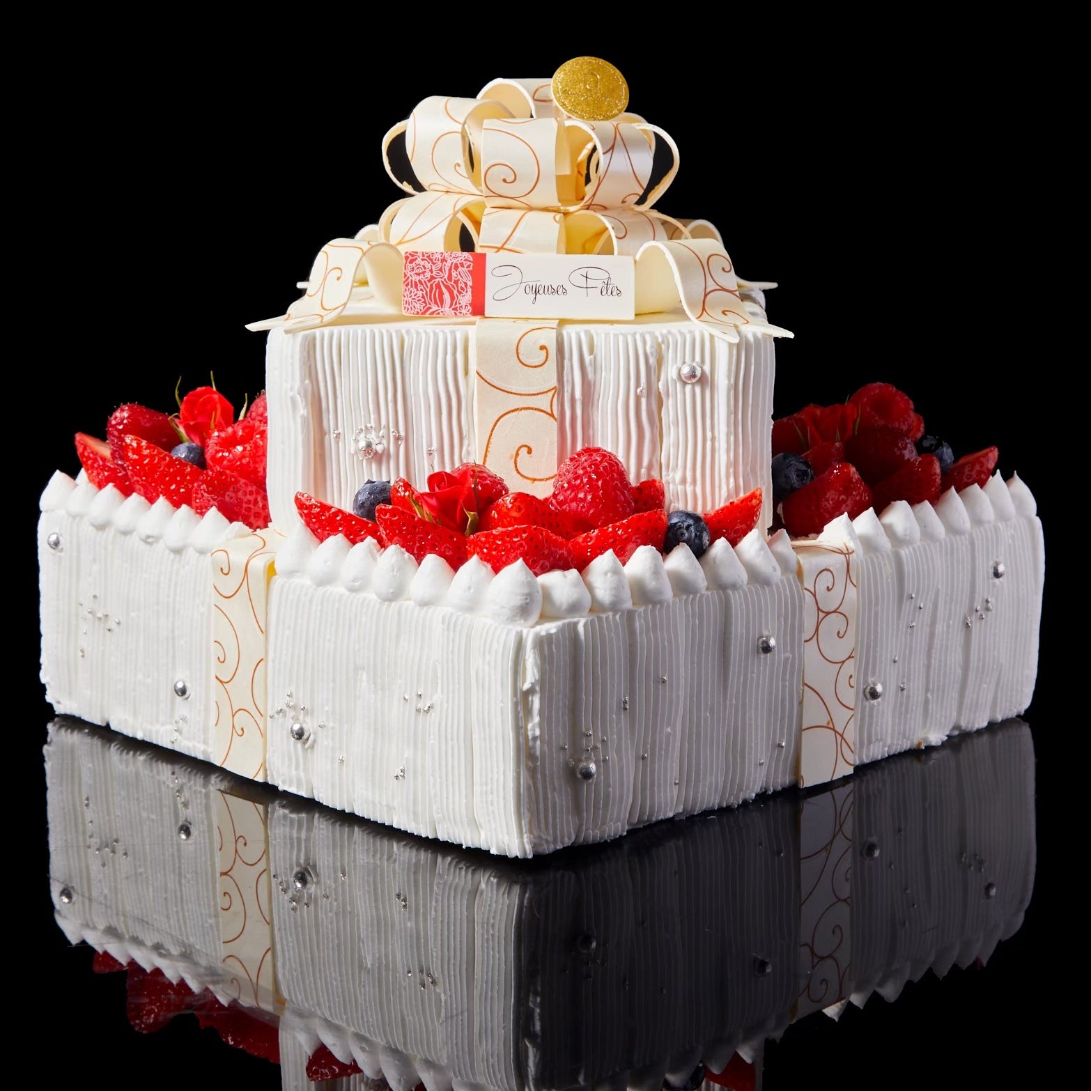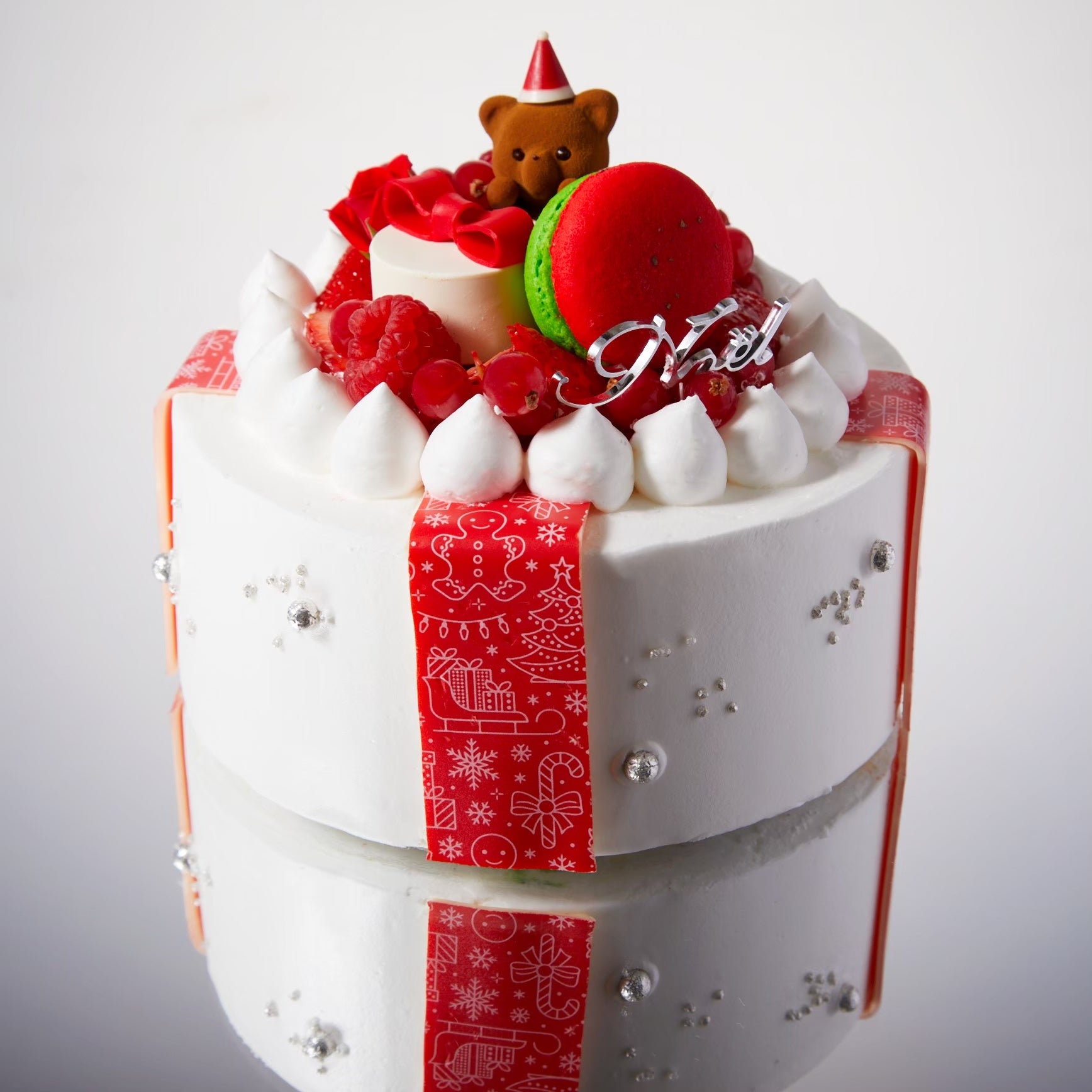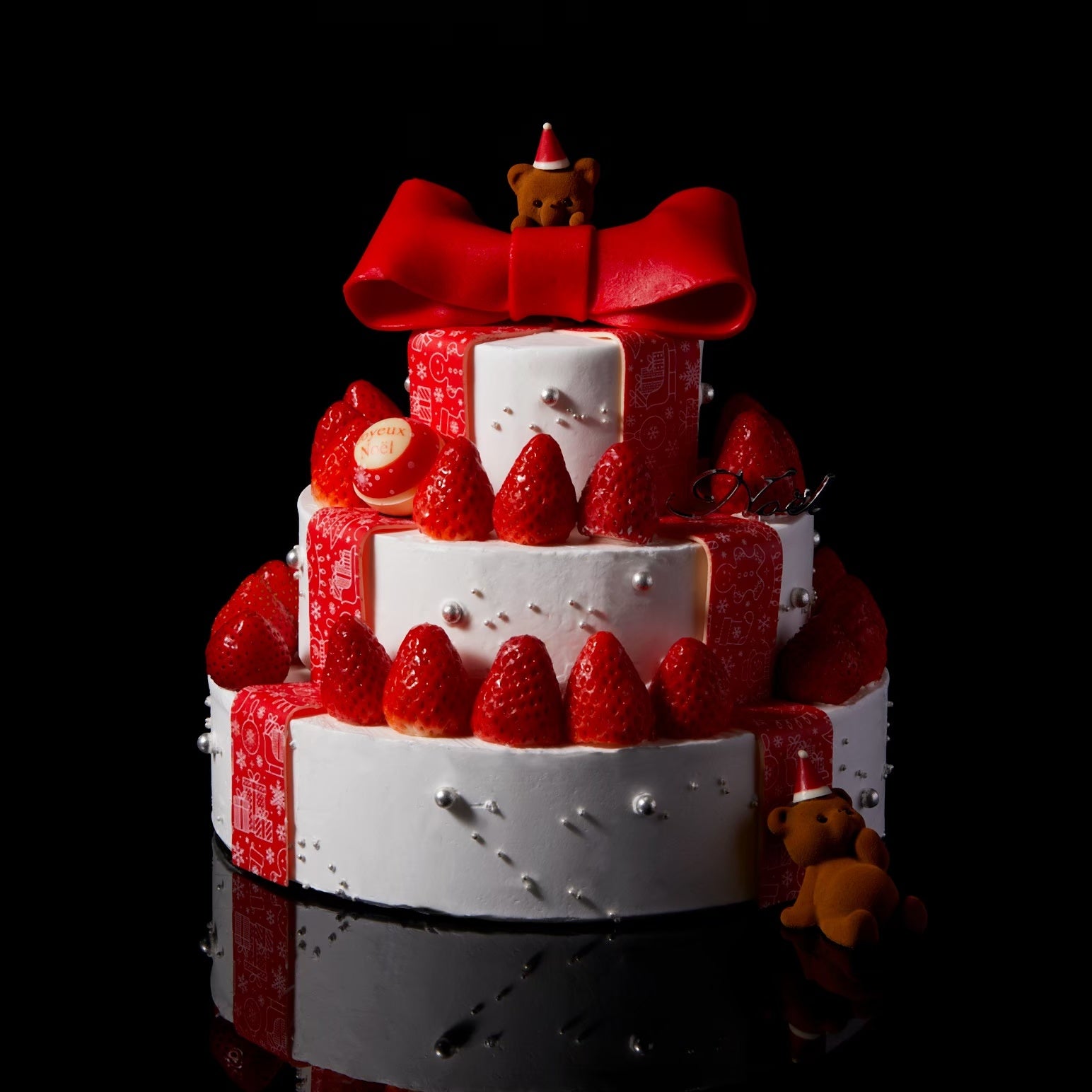 真っ赤なリボンがエレガントにクリスマスを演出する、3段仕立てのクリスマスケーキ。高級ブランド苺や太陽卵など、厳選した素材のみで仕上げた贅沢なショートケーキです。