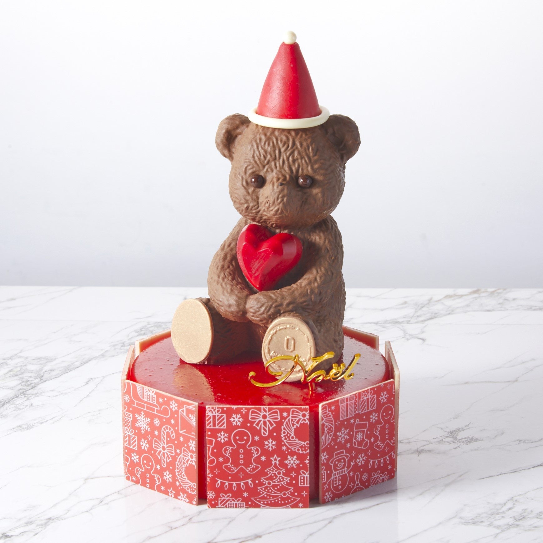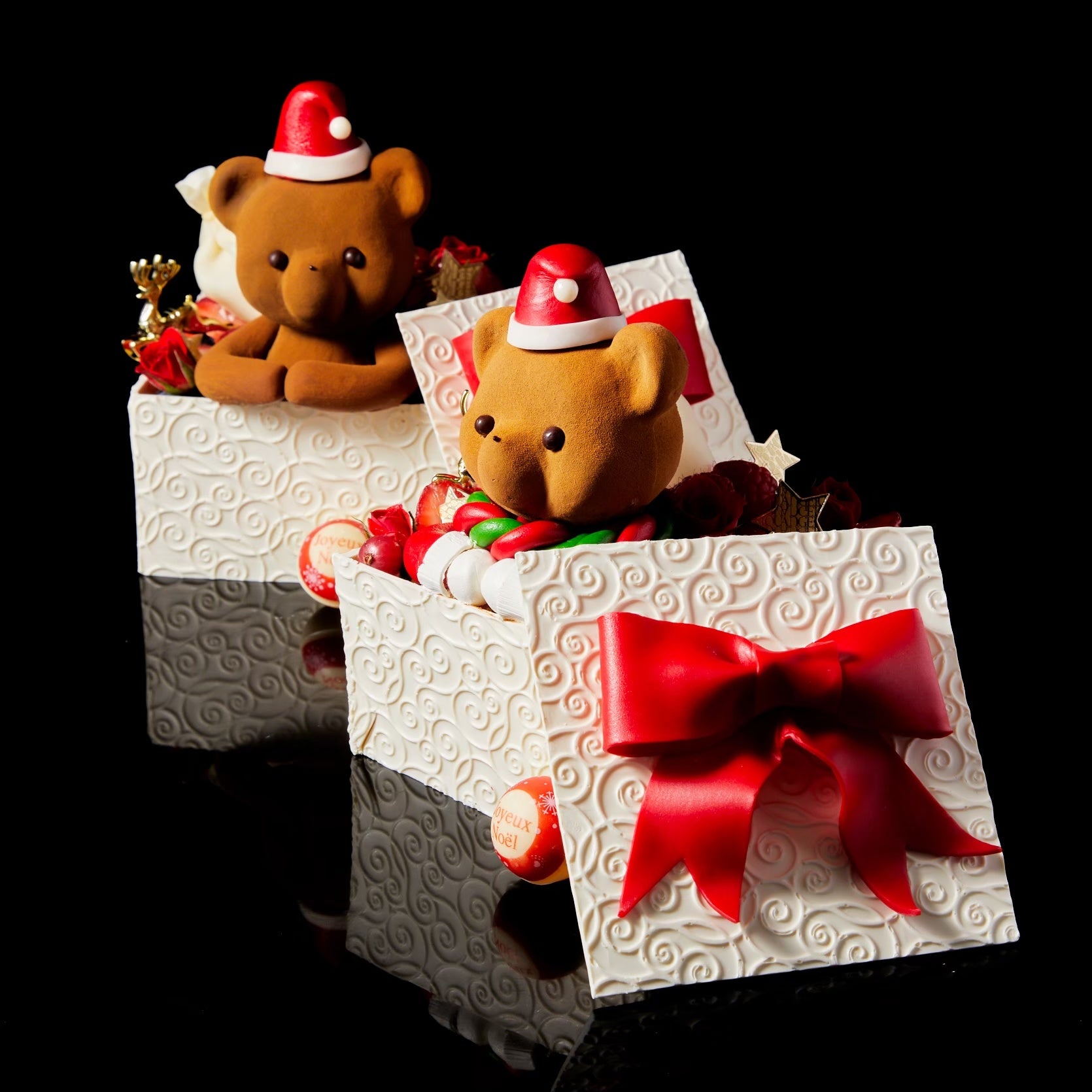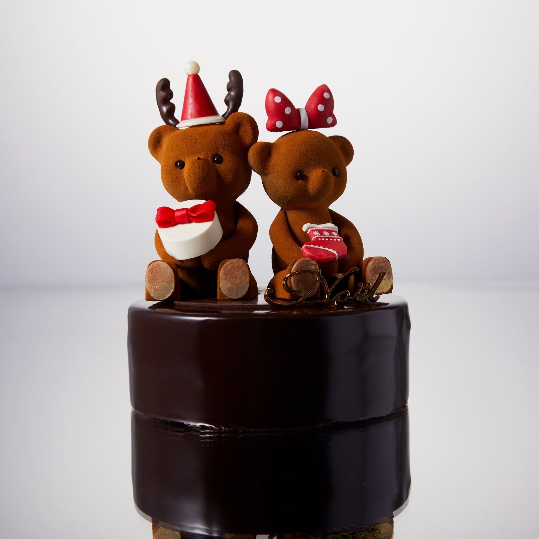 華やかなピンクとシックなショコラのマトラッセケーキを、上品な白いチョコレートギフトBOXに詰めた特別仕様です。サンタの衣装を纏ったヌヌースが可愛らしく寄り添い、開けた瞬間に心が躍るクリスマスギフトに仕上げました。