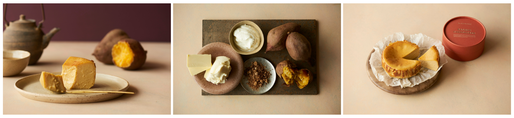 Mr. CHEESECAKEがつくるバスクチーズケーキは、高温で一気に焼き上げるのはもちろん、ただ焦がすのではなく、黒糖、焦がしバター、バニラを使用し、加熱することで起こるメイラード反応によって、ケーキ表面だけではなく全体から濃厚な旨味や香ばしさを感じることができます。生地は、香ばしい味わいとのバランスを考えて、クリームチーズと練乳を合わせ、コクと旨味にフォーカスを当てた味わいに仕上げており、その香ばしい旨味のある味わいは、焼き芋の香りや味わいと相性がとても良いのです。