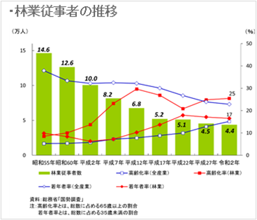 林業従事者の推移をみると、昭和55年の約14万6千人から令和2年には約4万4千人まで減少しています。