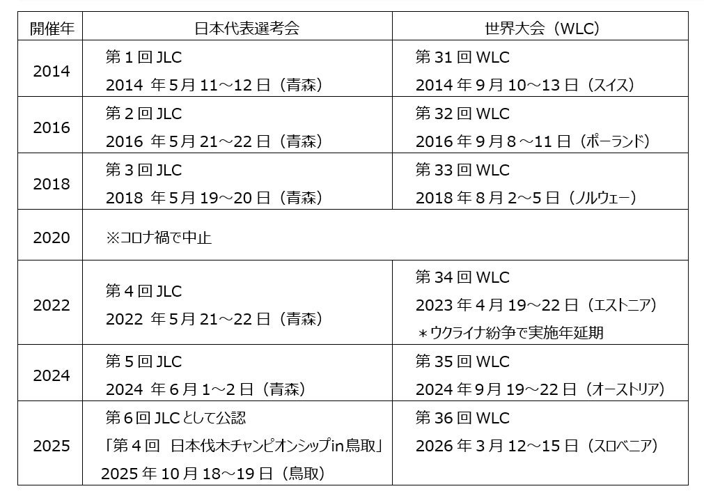 JLCは、2014年に第1回大会を実施以降、2024年まで2年に1回のペースで5大会を行っています(2020年はコロナ禍で中止)。これまで秋に開催されるWLCに向け、5月、6月に大会を行ってきましたが、次回WLCの開催が3月と早まったこと、また、過去5大会の実施により各地の林業関係者を中心に各所で国内大会が開かれるなど大会運営のレベルも高まったことなどから、今回、「第4回 日本伐木チャンピオンシップin鳥取」を第6回JLC公認大会として認定しました。