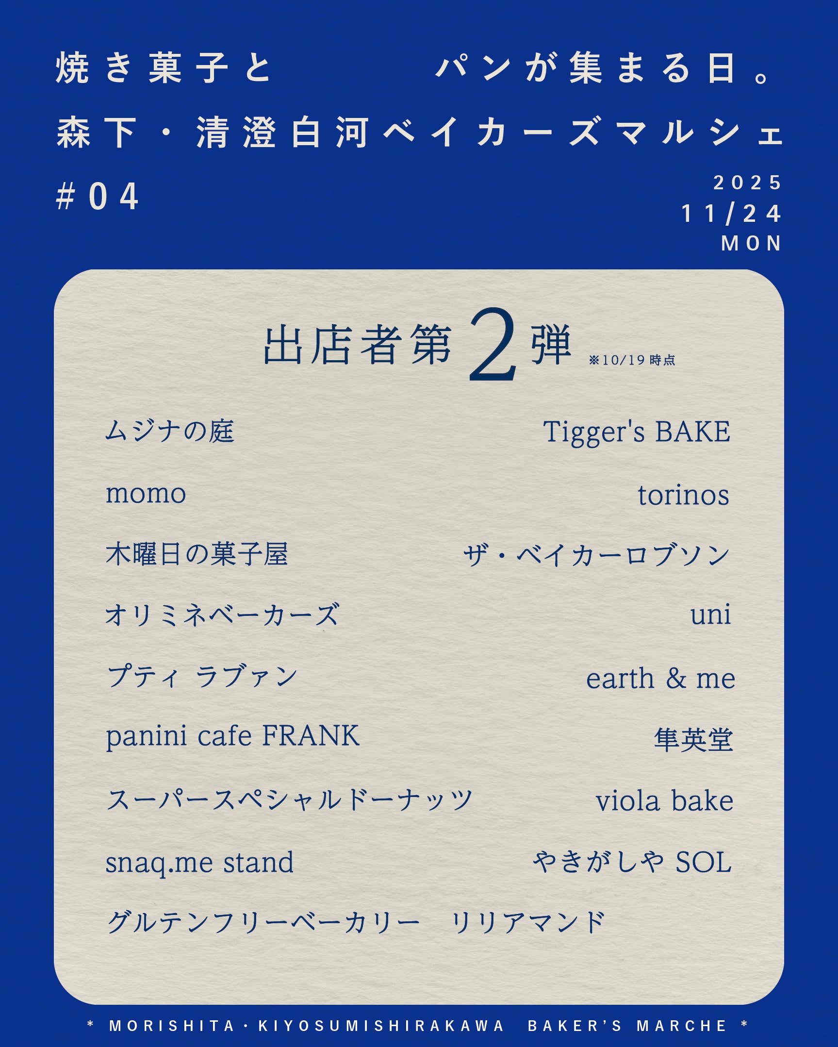 11月24日(月・祝)「焼き菓子とパンが集まる日。」をテーマにした『森下・清澄白河ベイカーズマルシェ』の第4回が開催決定!
