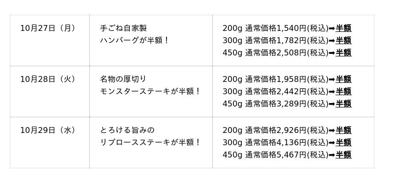 10月27日(月)から3日間、各店舗で対象商品を日替わりで半額にてご提供いたします。