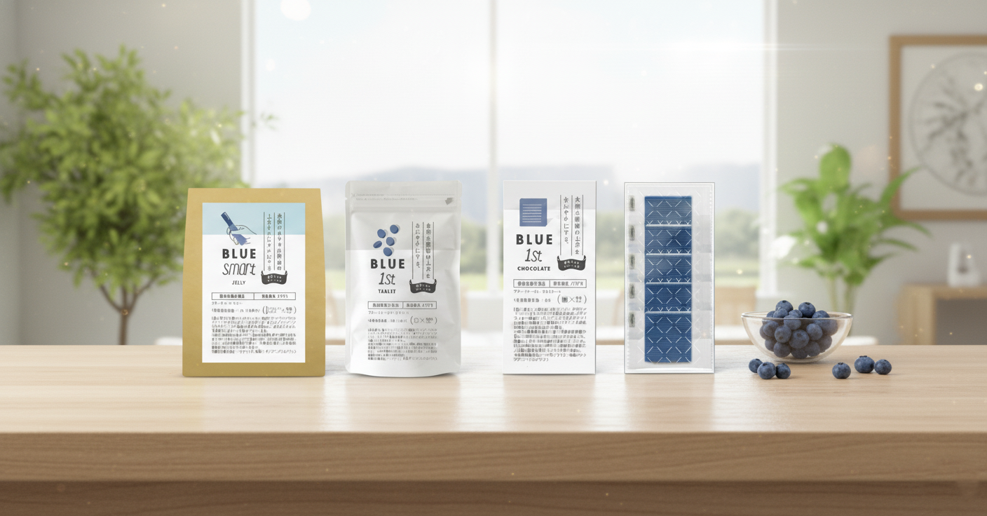 「青いゼリー」「青いタブレット」「青いチョコレート」という視覚的インパクトと、科学的に証明された機能性を両立させた、日本の健康食品市場における画期的な商品群をご確認ください。