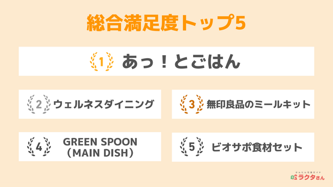 2位は「メニューの豊富さ」でトップだった「ウェルネスダイニング」。3位は「無印良品のミールキット」で、利用者数では全体5位に選ばれており、ブランド認知度の高さや、料金の安さから、利用しやすいと感じる人が多いのではないでしょうか。