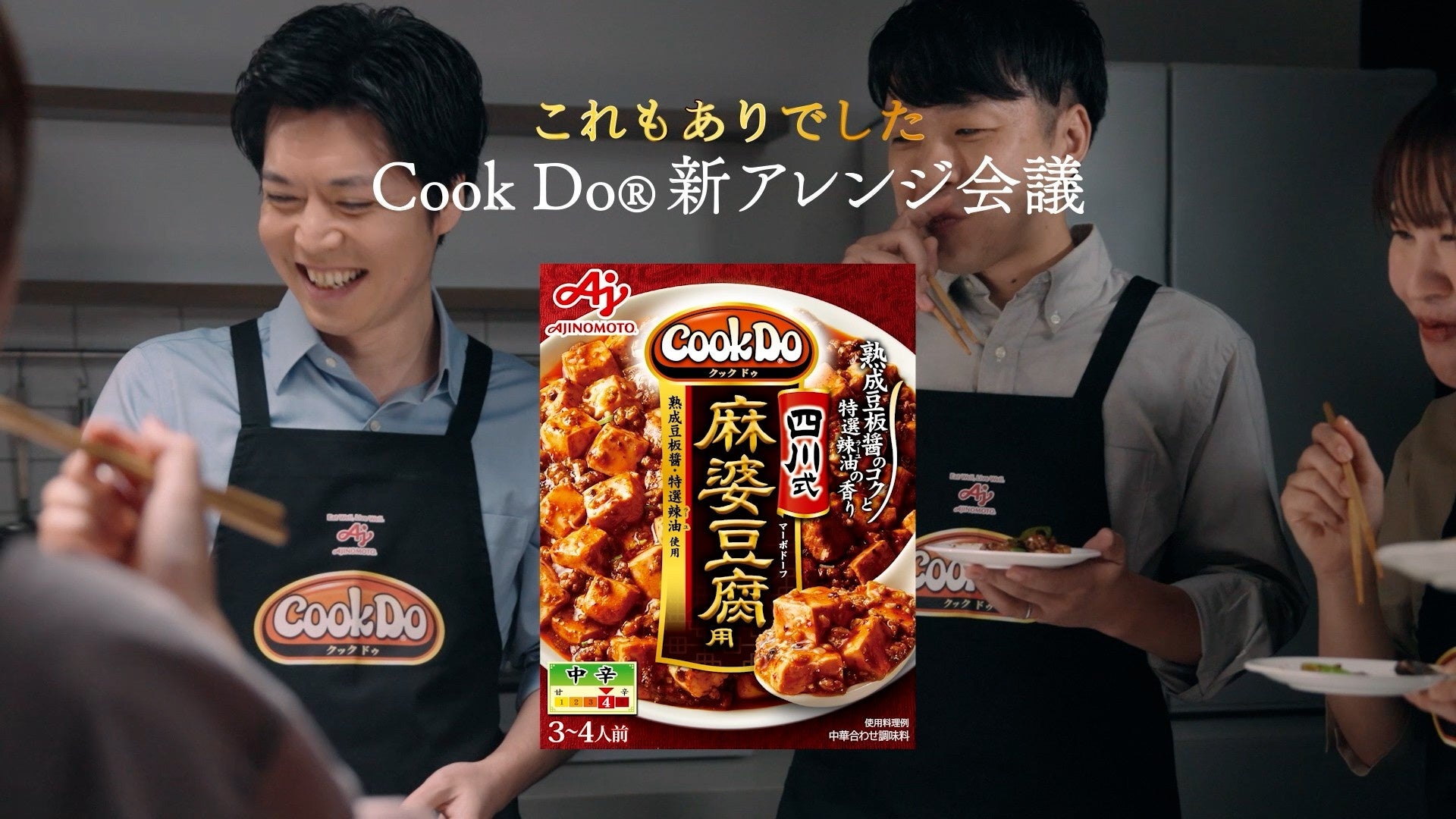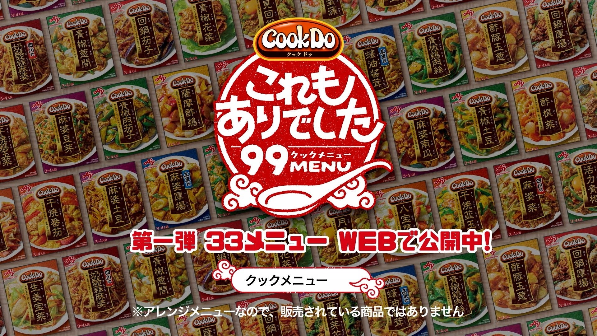 「Cook Do(R) (クック ドゥ)」にちなんで、開発担当メンバー公認の99品種のアレンジレシピを、第一弾・第二弾・第三弾の3回に分けて順次発表します。第一弾は10月23日(木)より?酪蒜麻婆(チーズニンニクマーボ)や回鍋厚揚(ホイコーアツアゲ)など33品種が登場。「Cook Do(R)」開発担当によるアレンジ会議の様子を映したWEB動画もレシピと同時に公開します。