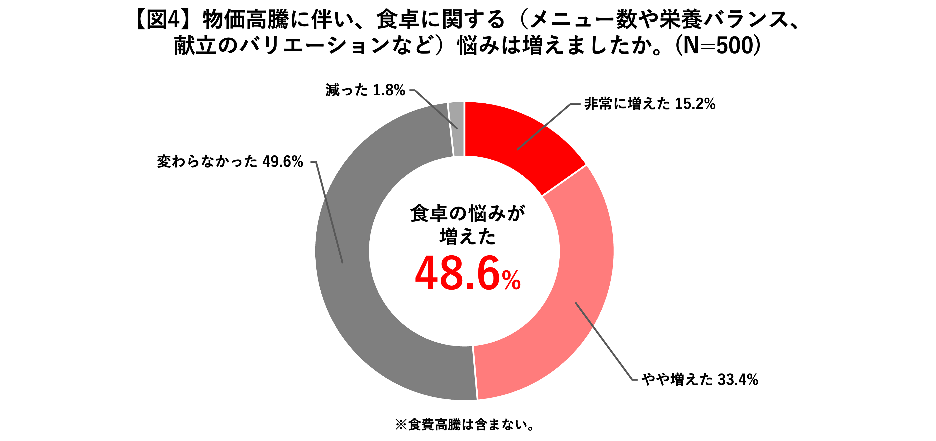 <Topic2>物価高騰で家庭の食卓も変化!約5割が食卓に関する悩みが「増えた」と回答 栄養バランスにも対応できない?「栄養ある食材を使いたいのに使えない」悩みを持つことが判明