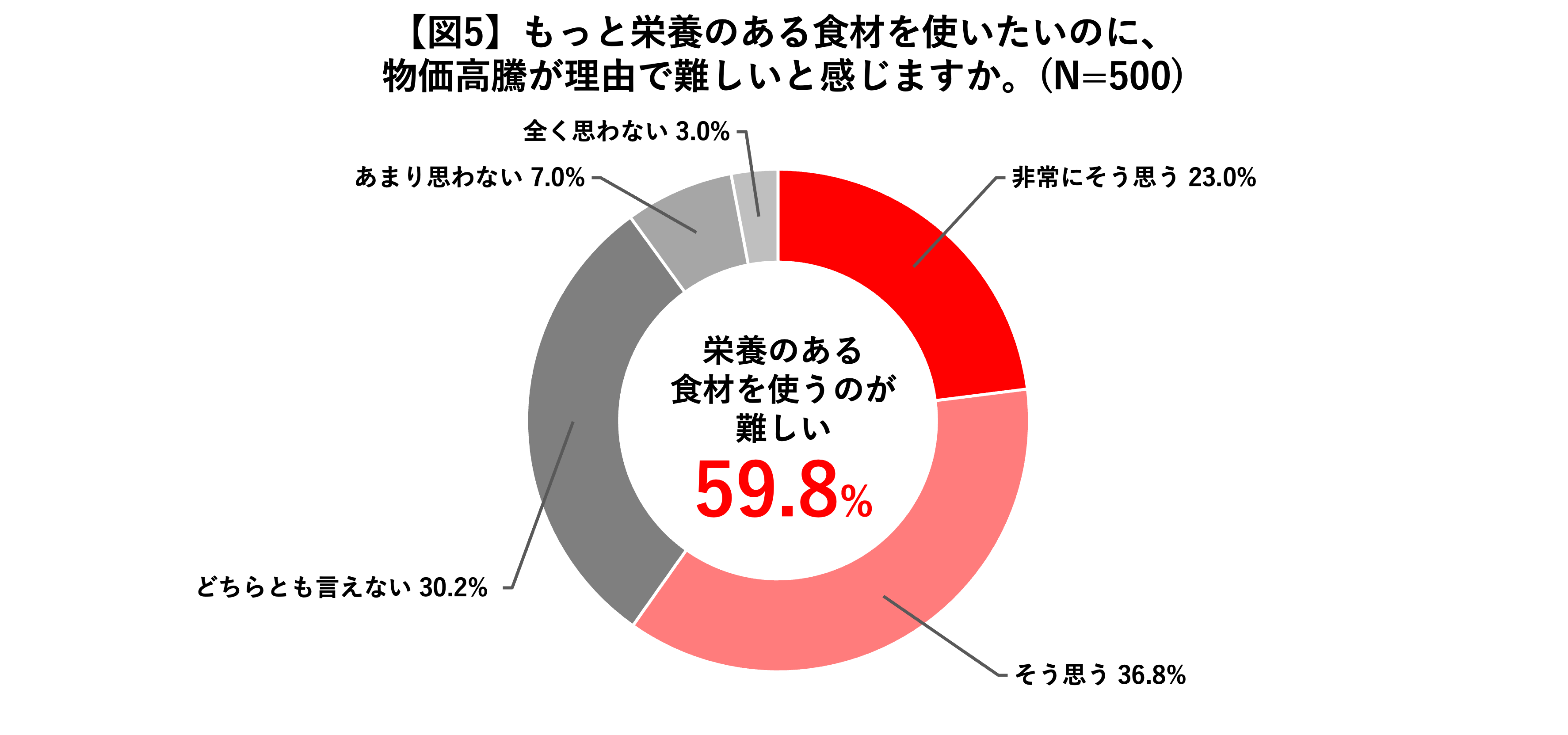 「物価高騰に伴い、食卓に関する(メニュー数や栄養バランス、献立のバリエーションなど)悩みは増えましたか。」の質問に対し、 48.6%が「非常にそう思う・そう思う」 と回答【図4】。食卓の悩みが増える中でさらに「もっと栄養のある食材を使いたいのに、物価高騰が理由で難しいと感じますか」の質問に対しては、 59.8%が「非常にそう思う・そう思う」と回答【図5】。物価高騰により食卓の悩みが増える中、栄養バランスを考えた献立作りも難しいと感じていることが明らかになりました。