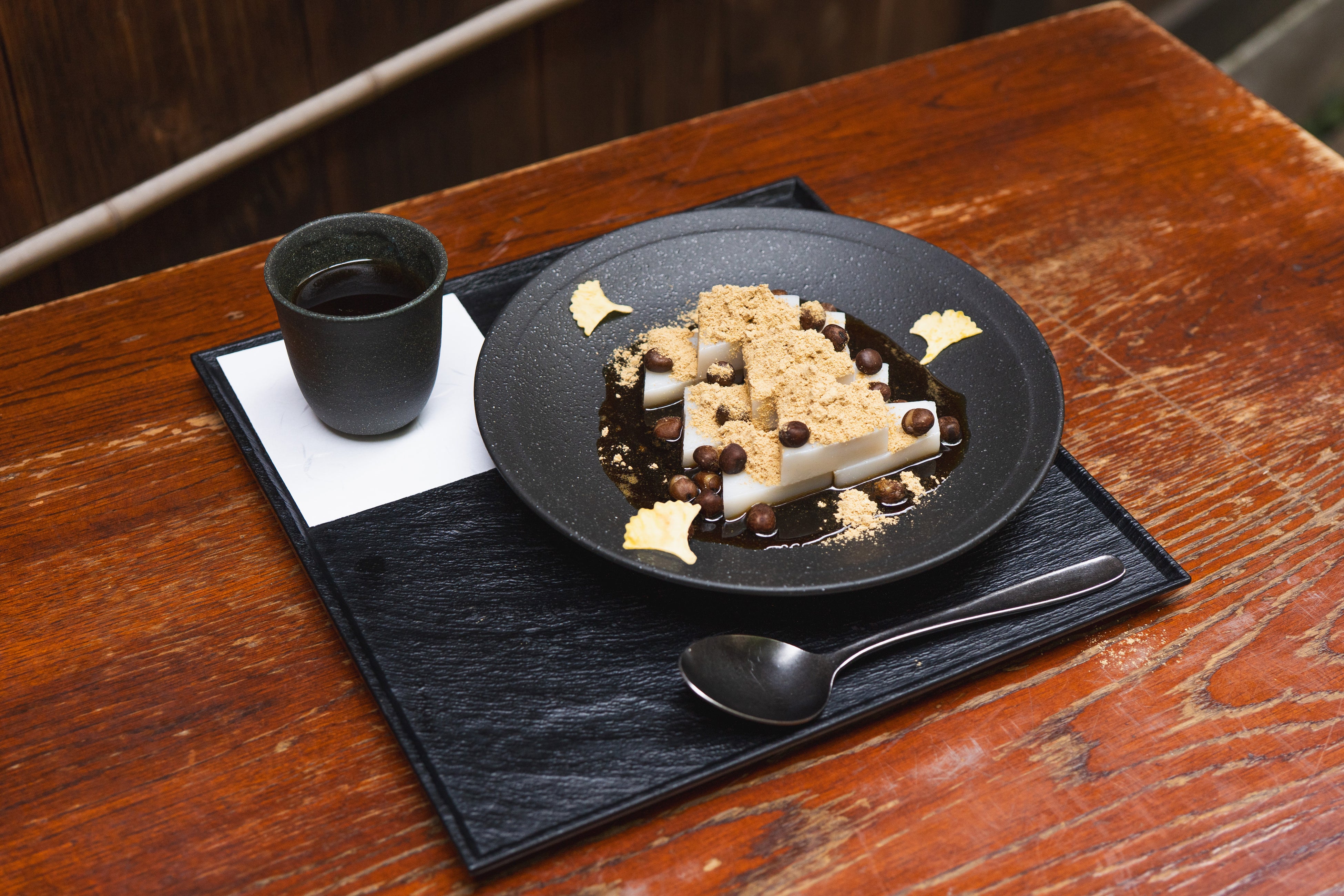 もちもちとした食感が魅力の船橋屋自慢のくず餅に、ほうじ茶の香りをまとわせた蜜ときな粉を合わせました。さらに、赤えんどう豆やさつまいもチップで彩りと食感のアクセントを加え、秋らしさを演出しています。