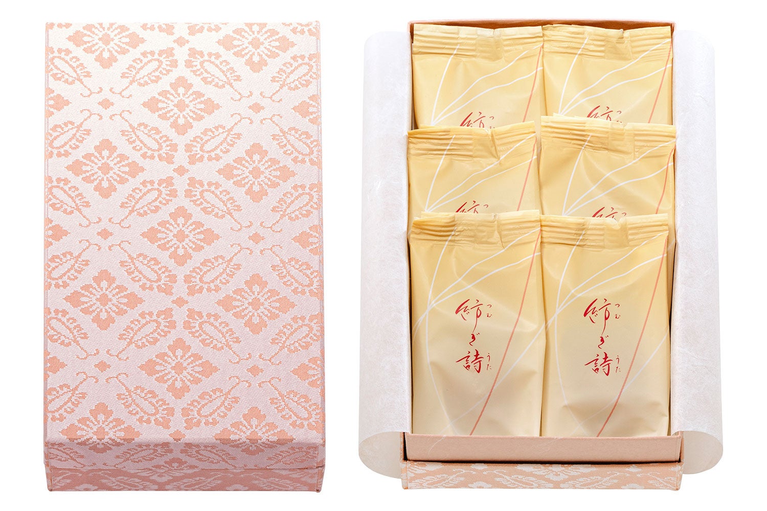 ●商品内容:焼菓子「紡ぎ詩」×6個、西陣織製カードケース×1個、西陣織印籠箱