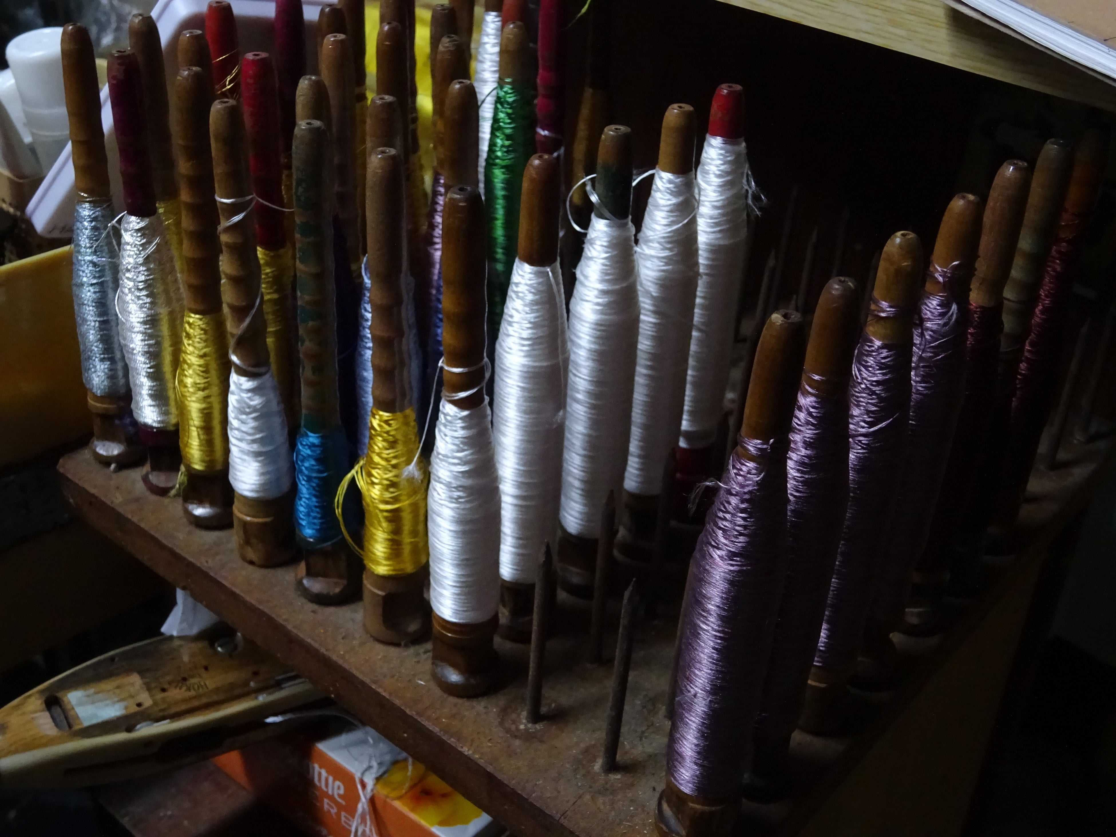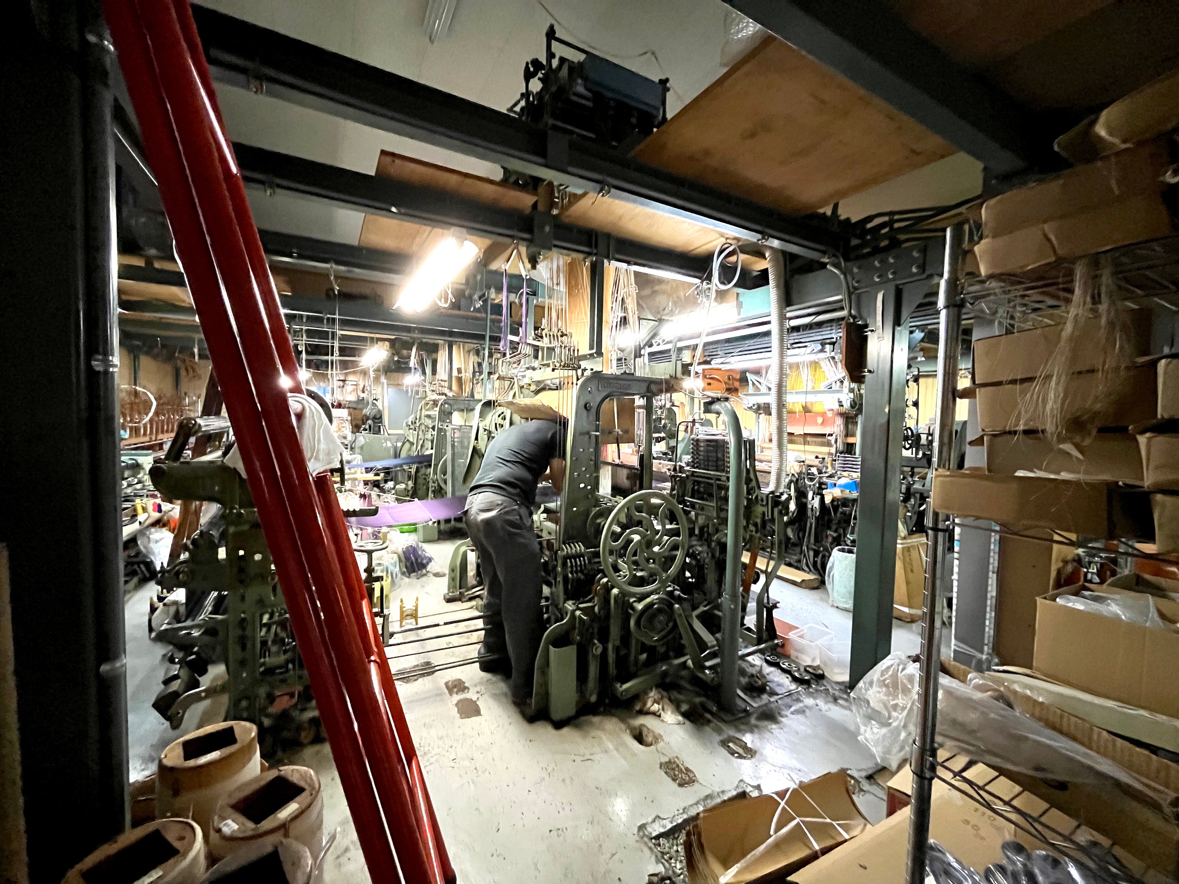 「渡辺金欄」様が現在の工場を立ち上げたのは、1976年、今から約50年前のこと。渡邉さんのお父様が着物の帯専門の工場として始め、のちに金欄専門の工場となり現在に至るとのこと。今までに宮内庁関連のお仕事や、お相撲さんのまわし等、確かな技術でさまざまな制作に携わってこられました。