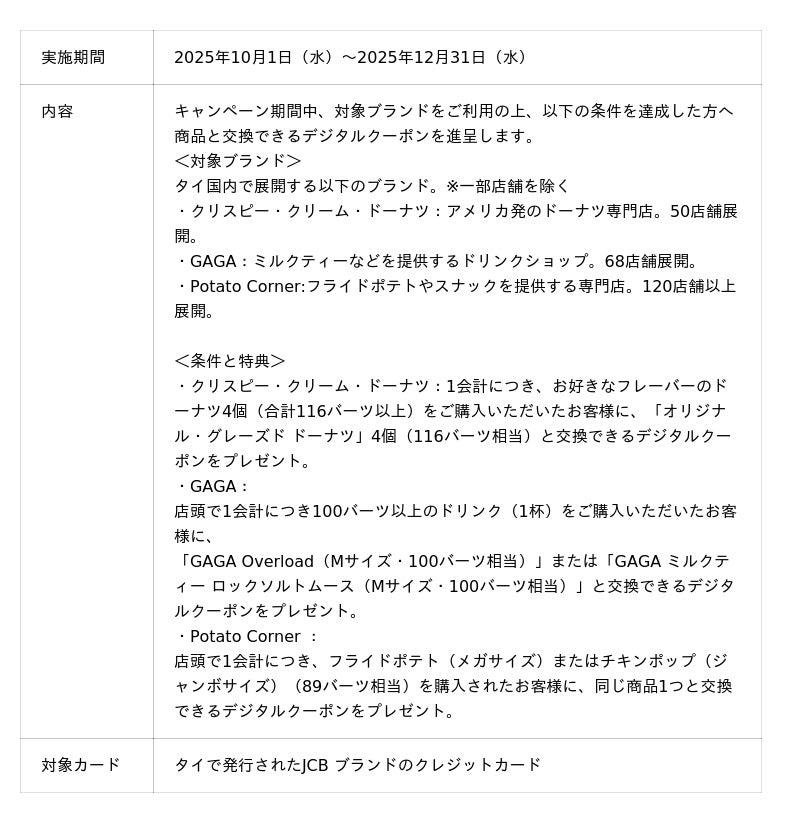 今回、バリューデザイン(タイ)とJCBは、バリューデザインのサービスを導入する店舗への送客、タイにおけるJCBカードの利用促進を目的に「JCB heal jai」キャンペーン第2弾を実施。期間中、JCBカードでの決済、条件の達成で、対象ブランドの商品と交換できるデジタルクーポンをプレゼントします。本年4月~9月末まで実施した第1弾に続き、第2弾ではドーナツショップ「クリスピー・クリーム・ドーナツ」のほか、新たなブランドとしてドリンクショップ「GAGA」、フライドポテト専門店「Potato Corner」を加え、購入額と同等の商品を受取ることができる、よりお得な特典を用意しています。
