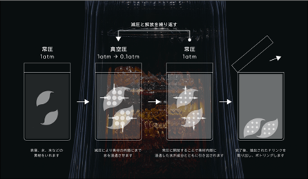 COLDRAWドリンクは、茶やハーブなど複数の植物素材を調合し、特許取得済みの冷温減圧技術で抽出する「できたてのプレミアムクラフトノンアルコール飲料(ネイチャーカクテル)」です。この独自技術により植物素材の優しい甘味や香り、旨味が凝縮され、フレッシュで奥深い味わいを実現しています。