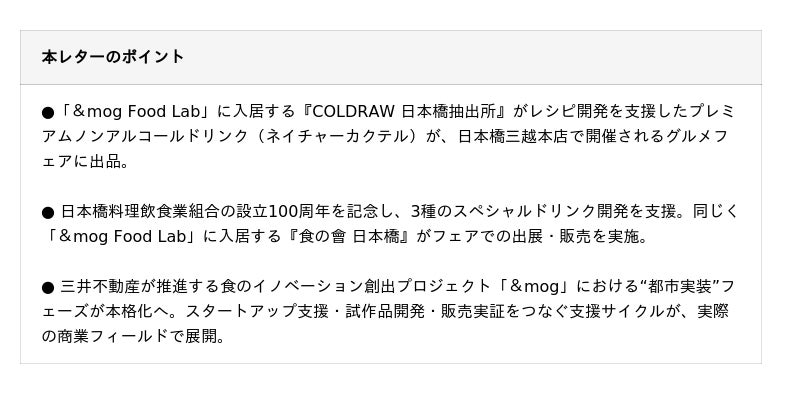 この度の『COLDRAW 日本橋抽出所』が開発支援したプレミアムノンアルコール飲料(ネイチャーカクテル)が出品されることは、「&mog」における“研究開発から都市実装へ”という取組みの本格化への第一歩です。今後も「&mog」を通じて日本橋から日本の食産業・文化を世界に発信することを目指します。