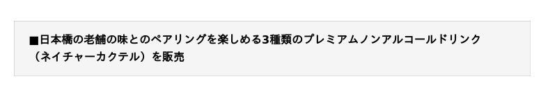三井不動産株式会社(本社:東京都中央区、代表取締役社長:植田 俊、以下「三井不動産」)は、食のイノベーション創出プロジェクト「&mog by Mitsui Fudosan(アンドモグバイミツイフドウサン)」の研究開発拠点「&mog Food Lab」に入居する『COLDRAW 日本橋抽出所』がレシピ開発を支援した3種類のプレミアムノンアルコールドリンク(ネイチャーカクテル)が、日本橋料理飲食業組合設立100周年を記念し、日本橋三越本店で開催されるグルメフェア「日本橋の街と共に歩み 次の100年へ」(10月29日(水)~11月4日(火))に出品されることをお知らせします。フェアでの出店・販売は、同じく「&mog Food Lab」に入居する『食の會 日本橋』が実施します。