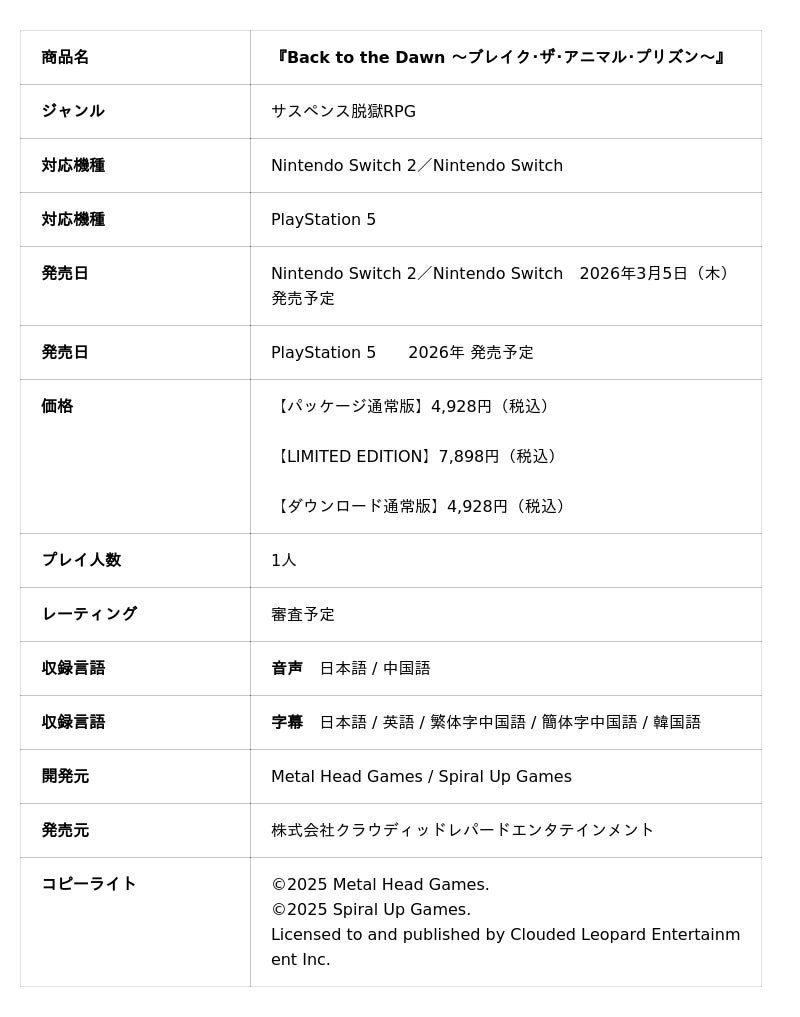 株式会社クラウディッドレパードエンタテインメント(本社:東京都品川区、代表取締役:陳 云云、以下CLE)は、Metal Head Gamesが開発する、サスペンス脱獄RPG『Back to the Dawn ~ブレイク・ザ・アニマル・プリズン~』のNintendo Switch(TM) 2版、およびNintendo Switch(TM)版を、2026年3月5日(木)に全世界向けに発売することをお知らせいたします。