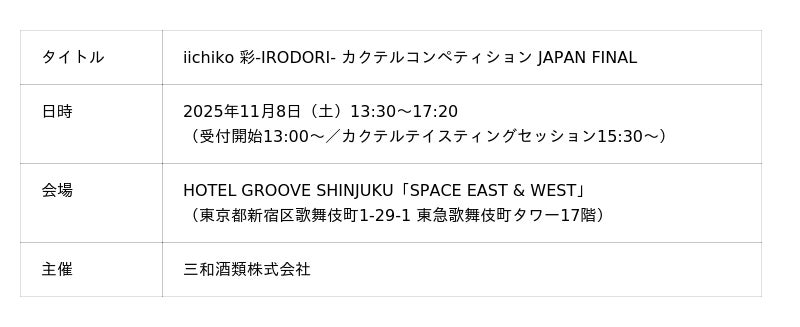 三和酒類株式会社(本社:大分県宇佐市 / 代表取締役社長:西 和紀)は、2025年11月8日(土)に日本初開催で「和 × 彩」をテーマとした『iichiko 彩-IRODORI- カクテルコンペティション 2025JAPAN FINAL 』を開催いたします。