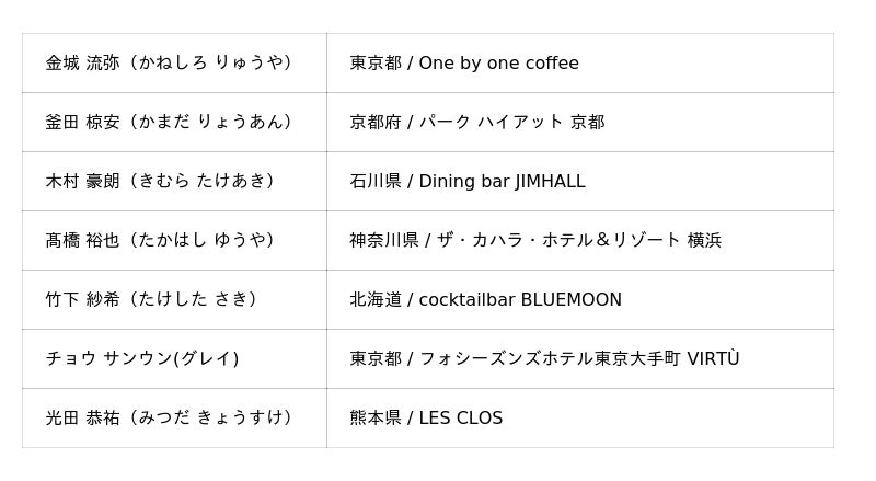 世界を代表するトップバーテンダー4名が審査員として参加し、ファイナリストの技術と創造性を厳正に審査します。