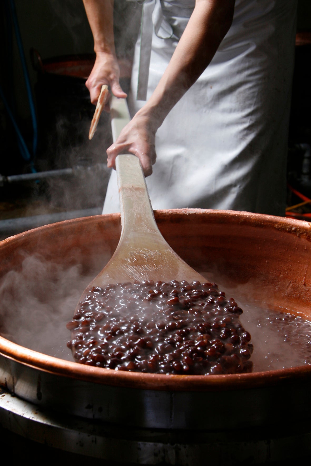 使用するのは全国小豆収穫量の約1%しかない希少な「丹波大納言小豆」。熟練の職人がその日の気温や湿度を見極め、一釜一釜丁寧に炊き上げています。その日の小豆の状態や気温・湿度に応じて、熱の入り具合を見極めるこだわりの技術によって、つややかで美しい餡が作り出されます。2012年以降は桜・蓬・栗・柚子など季節素材を取り入れた限定品も登場し、現在では年間約100万本を販売する人気銘菓となっています。