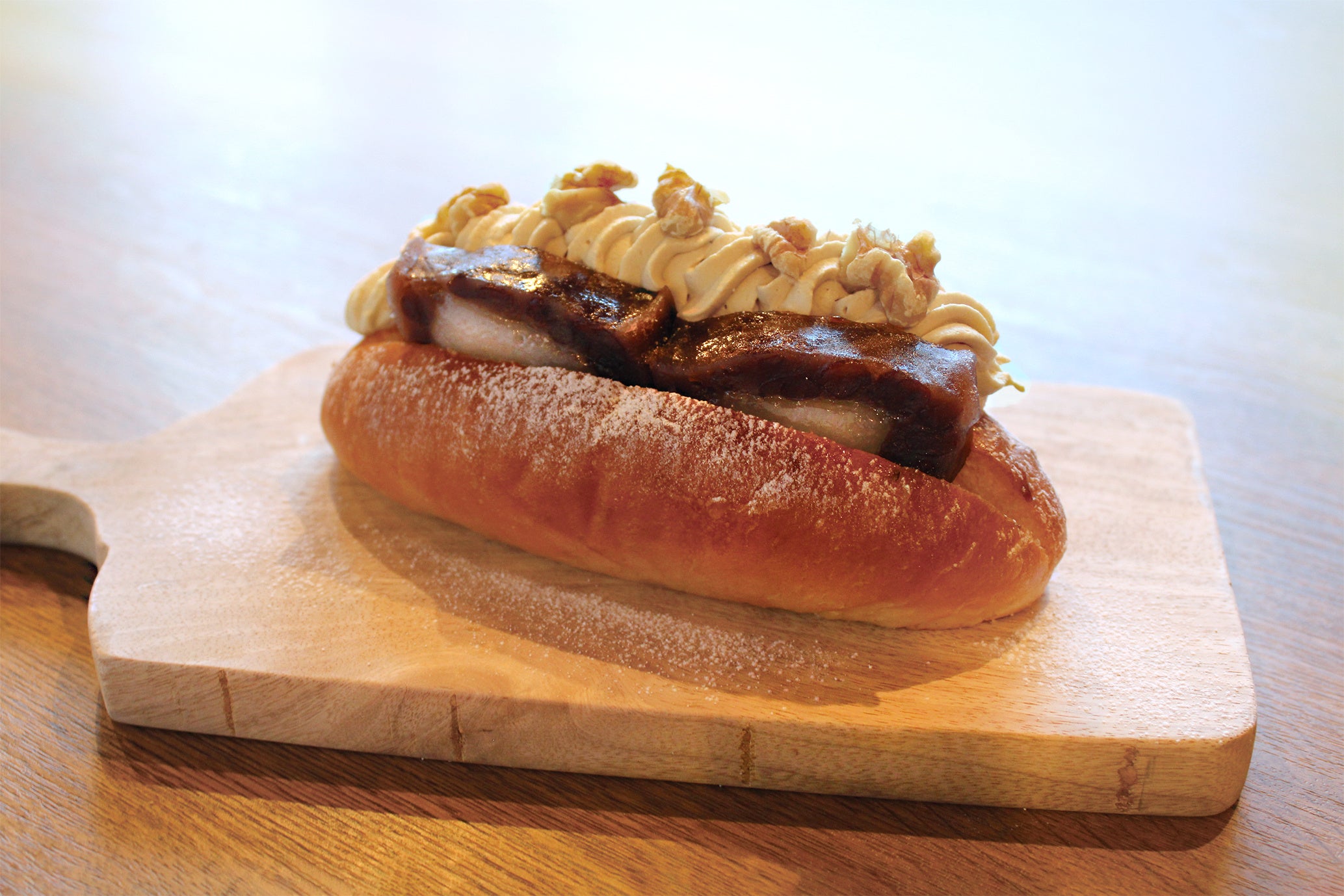 しっとりと焼き上げたどらやきの皮で、「あも」とバターを挟んだ「生あもどら」。通常税込350円のところを、まつり限定特別価格の280円で提供いたします。